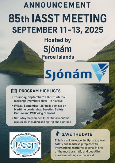 We are delighted to announce that the 85th International Association for Safety and Survival Training (IASST) Meeting and Seminar will take place on the Faroe Islands from September 11–13, 2025, hosted by Sjónám.